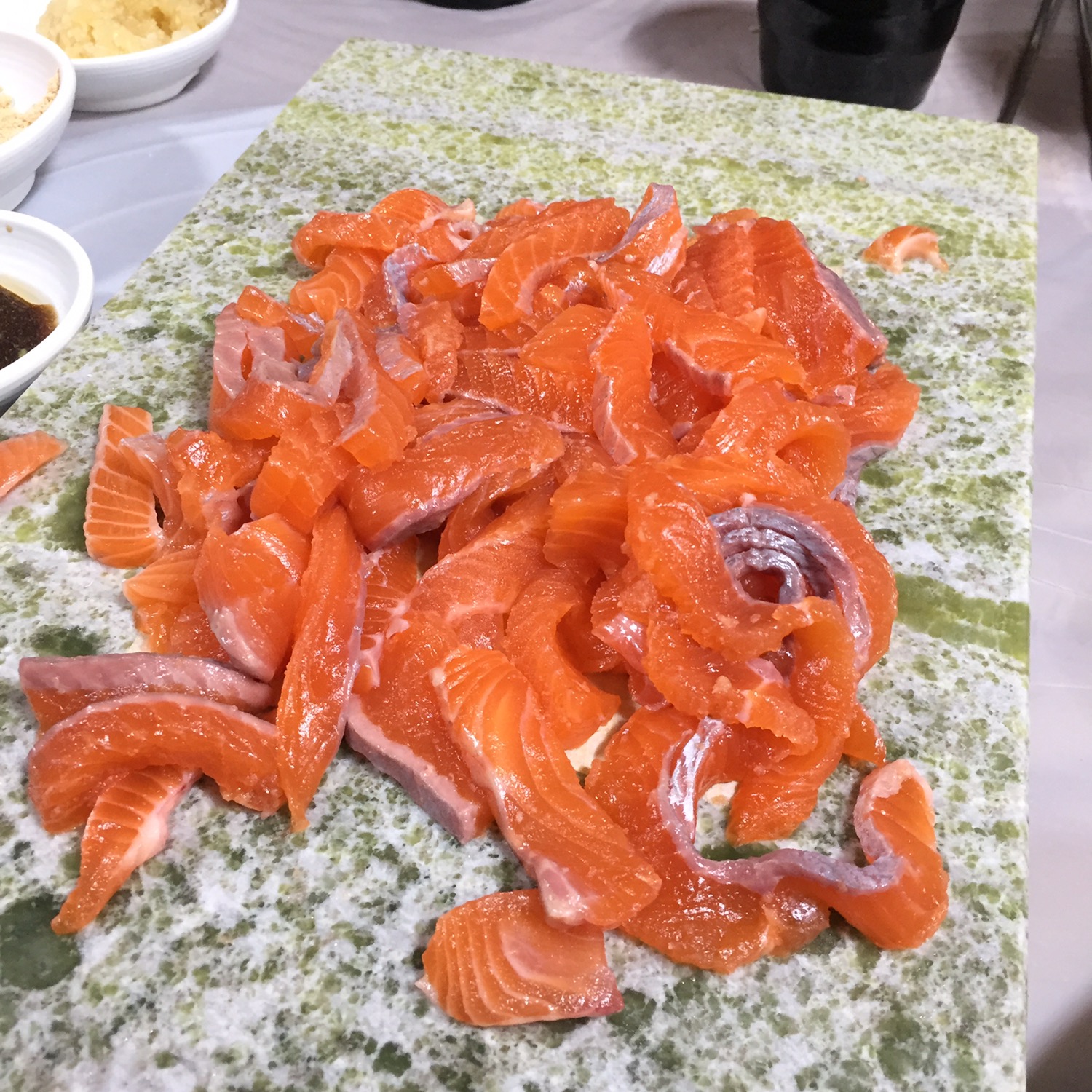 지금도 사진을 보면서 침을 꿀꺽 삼켰는데요, 정말로 싱싱했습니다. 생김새는 연어회와 비슷하게 보이면서도 더 조밀하게 된 구조를 볼 수 있습니다. 평소에 회를 많이 즐기는 편은 아니지만 이 회는 정말로 맛있었습니다.