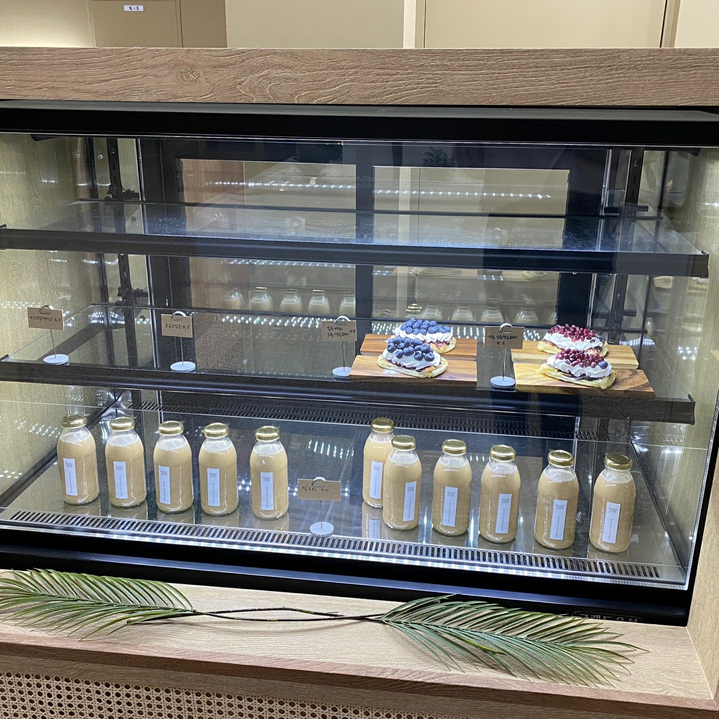 스콘과 크루와상, 오트밀 쿠키와 앙버터 빵류를 팝니다. 밀크티는 사진과 같이 유리 진열장에 진열 되어 있습니다. 그 위에는 과일과 생크림이 올려진 듯한 빵을 판매합니다.