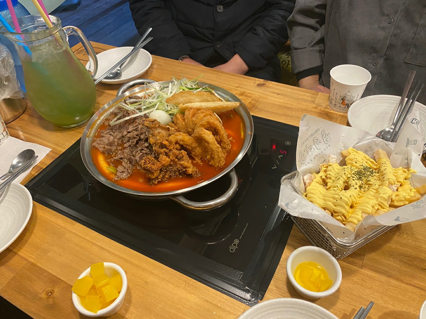 엄청난 맛집은 아니지만 맛있습니다. 아는 맛이 더 치명적인 것 아시죠? 통큰오짱세트로 4인이 배부르게 먹었습니다. 가성비도 좋습니다. 다만 북면점의 경우 주차장이 없습니다. 근처 공터에 주차하고 와야 합니다. 안 그러면 주차 단속에 걸릴 수 있습니다. 떡볶이가 땡기는 날이라면 추천드립니다. 매운 것을 잘 못먹는 저도 버터갈릭감자튀김과 함께라면 이겨낼 수 있습니다. 맵기도 지나치게 맵지 않아서 적절합니다.