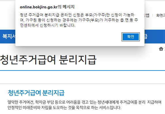 제가 직접 복지로에서 신청해 보니 청년이 직접 신청은 안된다는 팝업이 떴습니다. 때문에 부모님이 신청해야 온라인으로 진행 가능하며, 청년이 직접 신청하려면 거주하는 읍, 면, 동 주민센터에서만 가능합니다. 제가 위에 작성한 제출서류를 참고하세요.