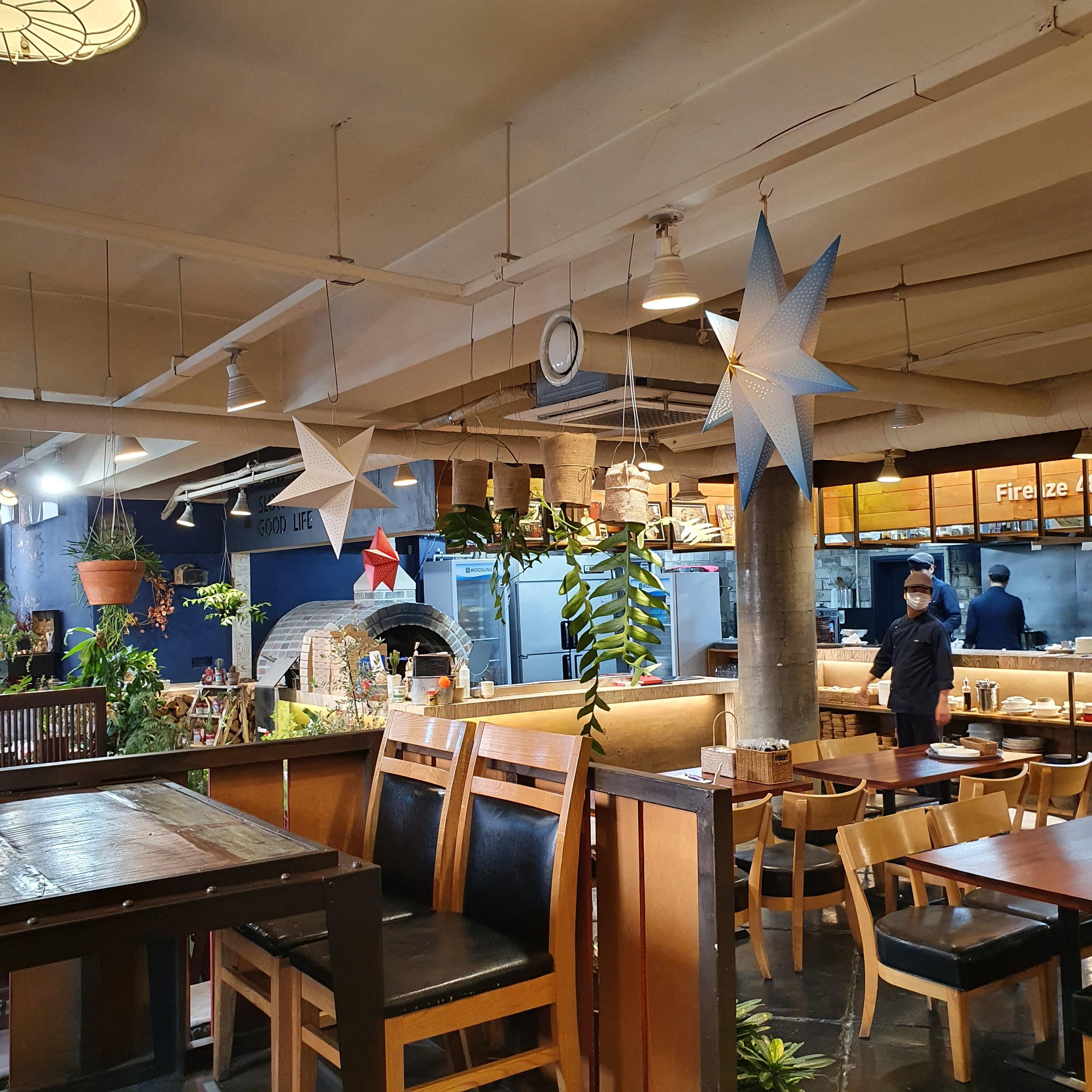 내부 인테리어는 잘 꾸며져 있습니다. 초록색 식물을 배치해서 눈이 편안하게 했고 곳곳에 별 등의 조형물이 달려있습니다. 지금 보니 식물이 역류하며 자라는 것은 좀 신기하네요. 주방이 오픈형으로 되어 있어서 만드는 과정을 볼 수 있습니다. 나름 청결하게 운영하는 곳에서 이런 구조를 볼 수 있지요.